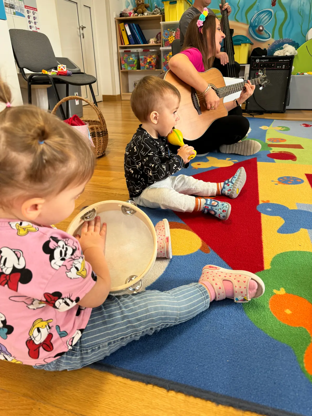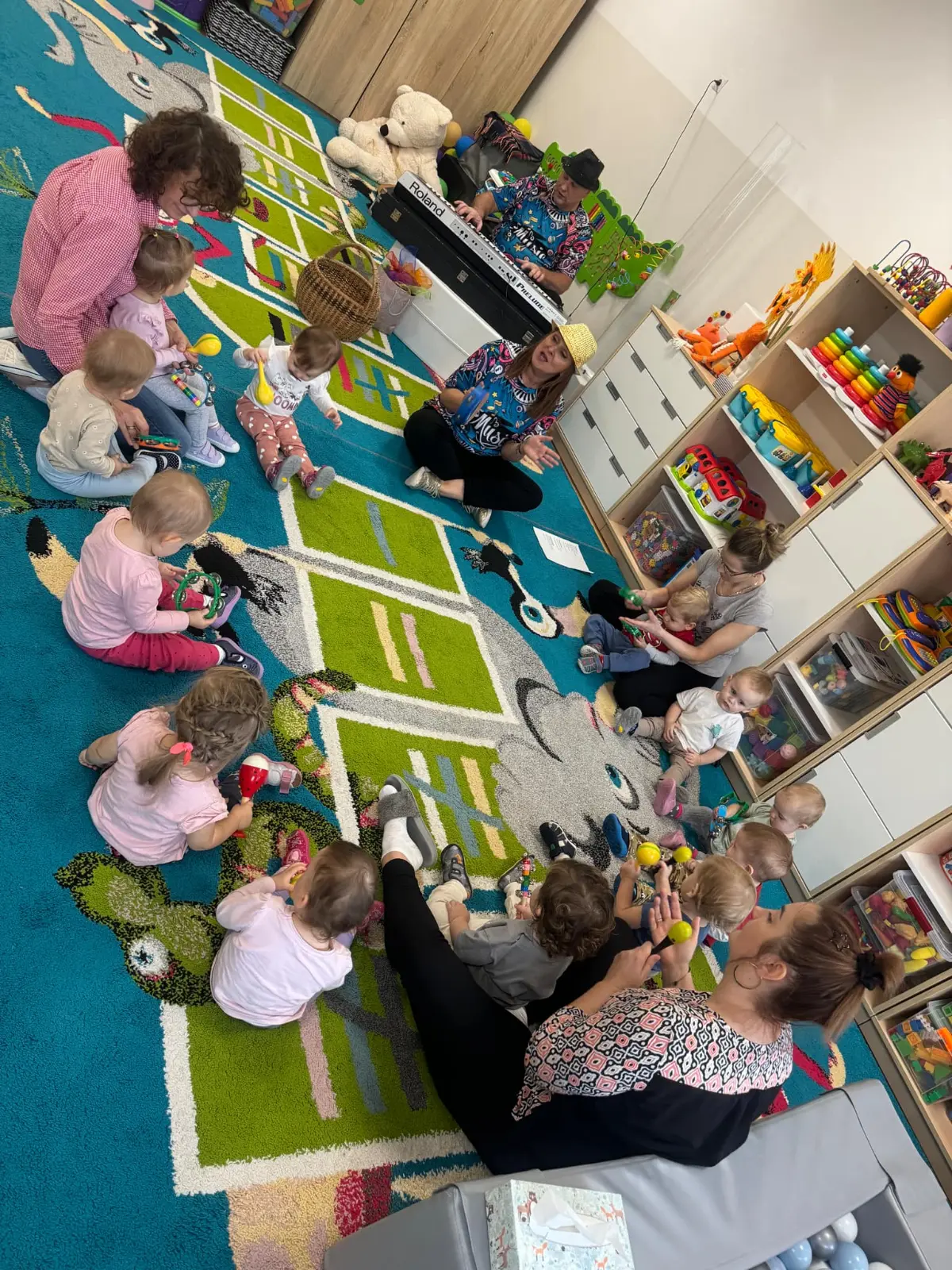Raz w miesiącu w każdej grupie rytmika prowadzona jest przez pracowników z przygotowaniem do prowadzenia zajęć z rytmiki i zajęć gordonowskich, z wykorzystaniem m.in. instrumentów muzycznych. Codziennie przez opiekunki żłobkowe prowadzone są zabawy umuzykalniająco-rytmicznych, mające na celu kształtowanie poczucia rytmu, koncentracji uwagi i koordynacji słuchowo-ruchowej oraz rozwój motoryki dużej i małej. Każdego dnia podczas zabawy dzieci doskonalą w sobie estetykę ruchu, zdolność do wyrażania emocji za pomocą muzyki, tańca, śpiewu. Zabawy ruchowe ze śpiewem, to rodzaj gimnastyki twórczej i improwizacji ruchowej, wykorzystującej naturalną ruchliwość dzieci. Celem ćwiczeń jest rozwijanie kreatywności, inwencji twórczej, doskonalenie płynności ruchów oraz kształtowanie umiejętności współdziałania.